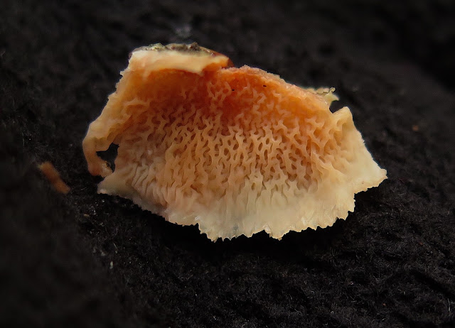 Here's the last fungus I found today, this salmon-pink, rather gelatinous growth I found spreading across a debarked log on the forest floor. It's called Phlebia tremellosa, with the common name of Wrinkled Crust. Apparently, according to what I have read, this is a commonly occurring wood-rotting fungus, although I have never come across it before.