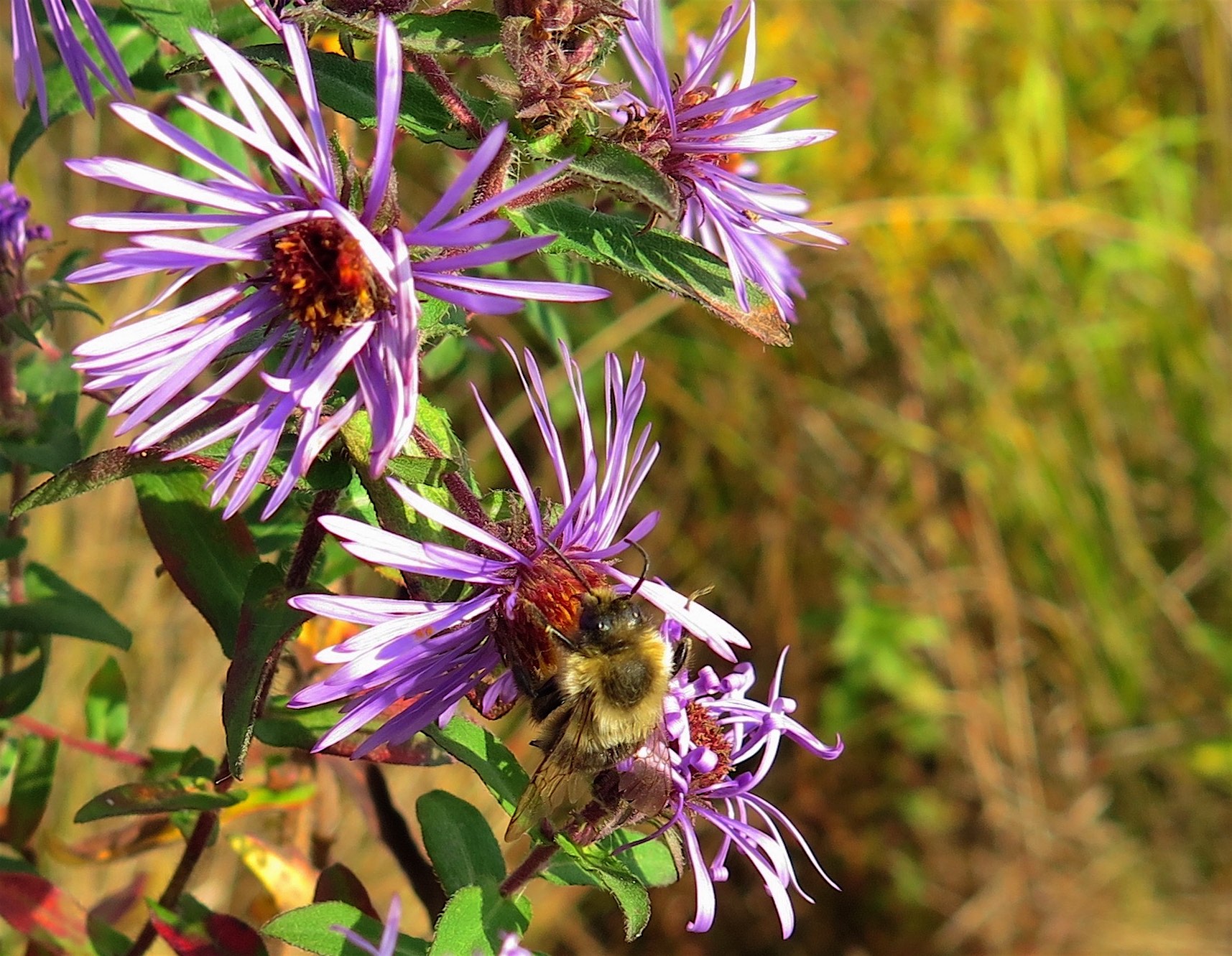 I did find a few flowers valiantly holding on. This bumble bee must have been happy to still find a source of nectar and pollen as it busily foraged the deep-purple blooms of a solitary New England Aster.