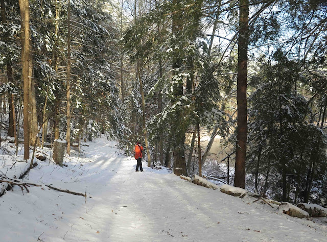 Whoa! Big change from just a few days ago when temps approached 60 degrees! But when I woke up Monday morning after a clear cold windless night, I was startled to read the thermometer: SEVEN DEGREES ABOVE ZERO!!! I'm so glad my pal Sue Pierce and I had agreed to meet at Moreau Lake this day. We'd bet we'd find new ice on the lake, and we were not disappointed.